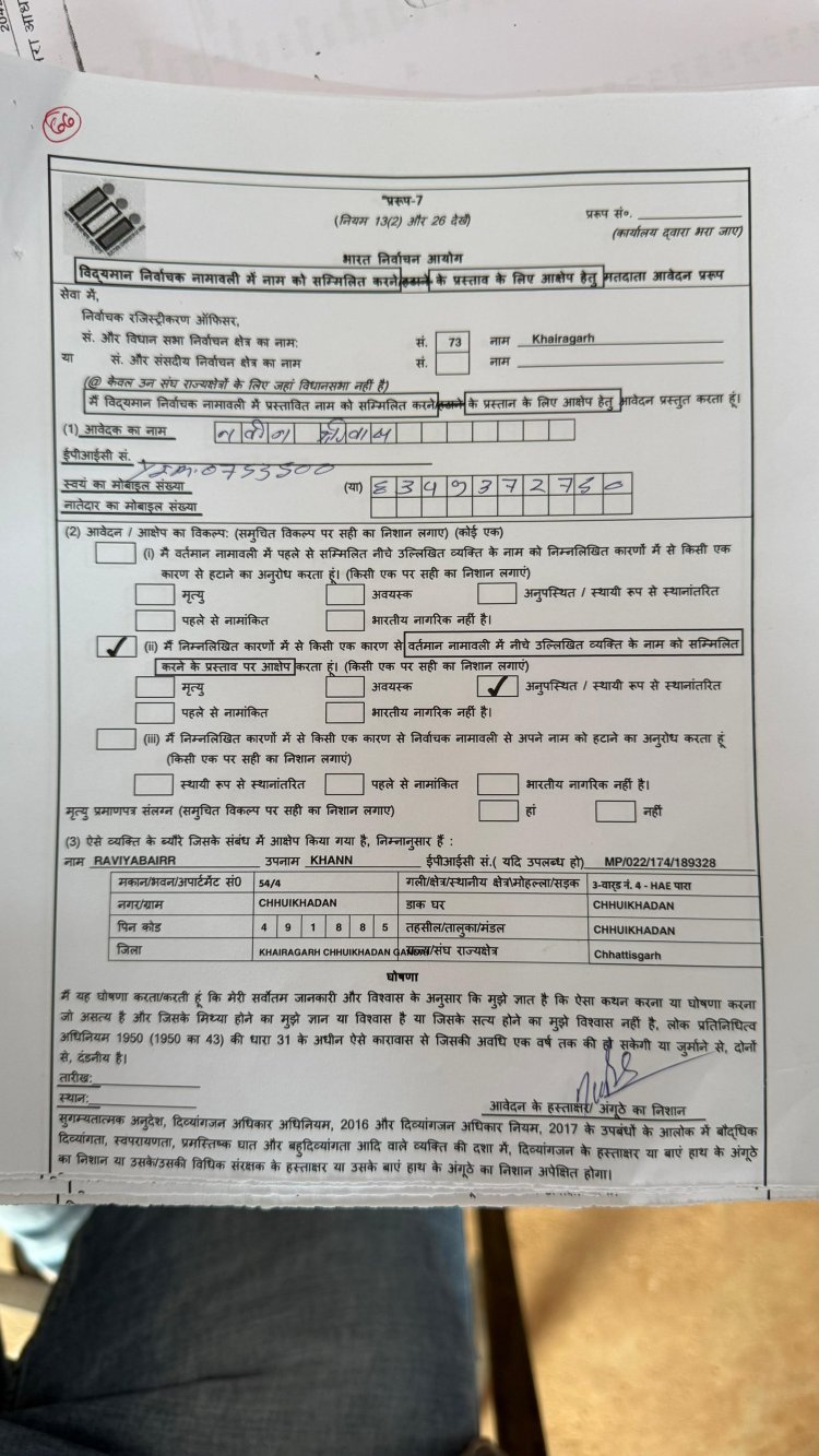 छुईखदान==एसआईआर (विशेष गहन पुनरीक्षण) सर्वे के नाम पर जिले में मतदाता सूची से नाम काटने को लेकर गंभीर आरोप सामने आए हैं। आरोप है कि बिना ठोस सबूत के फार्म-7 के जरिए एक वर्ग विशेष, विशेषकर मुस्लिम समाज के मतदाताओं को निशाना बनाया जा रहा है और सुनियोजित तरीके से आपत्तियां दर्ज कराई जा रही हैं।