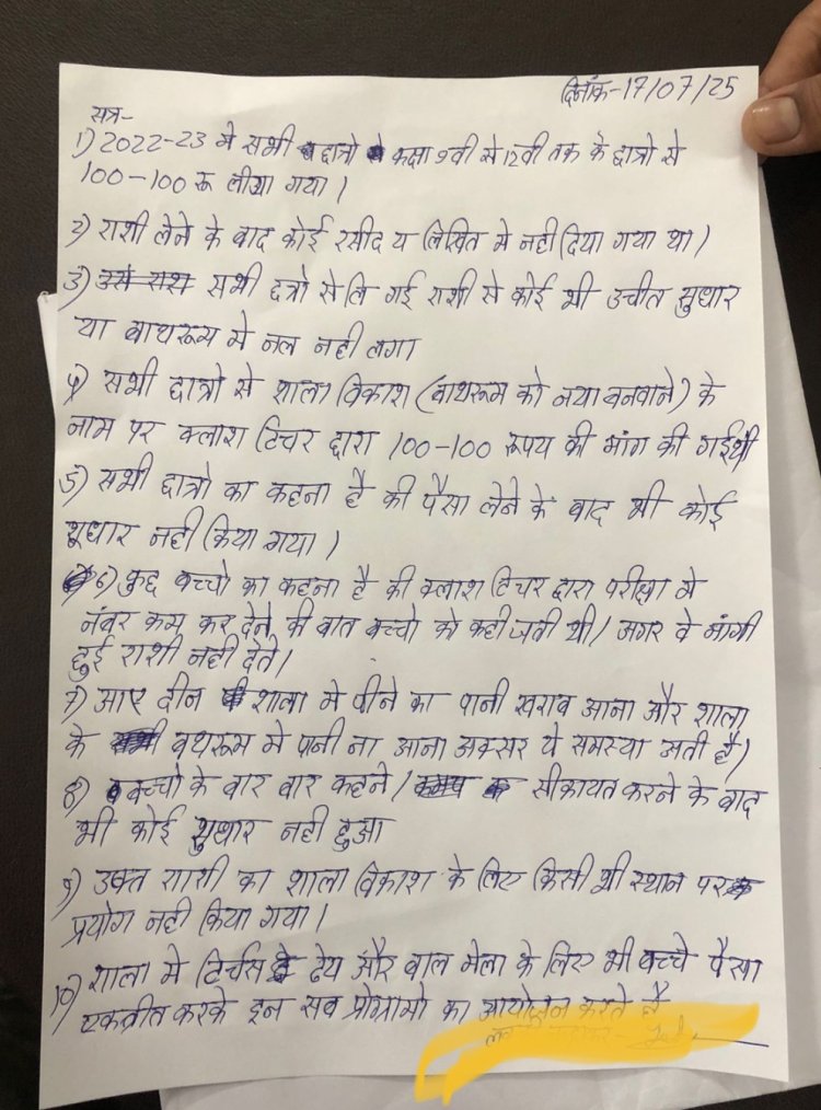 एक छात्र ने एक पत्र वायरल किया कि प्रशासन की ओर से सन् 2022-23 में लगभग हाई स्कूल के छात्रों से प्रति छात्र सौ रूपए शाला मे अध्यनरत छात्र छात्राओ को साफ सुथरा वाशरूम,शुद्ध पेयजल,साफ सुथरा मग गिलास, आदि मुहैया कराए जाने के वायदे के साथ बिना कोई रसीद या पावती के छात्रों से पैसे लिये जाने की जानकारी की चर्चा नगर में चल रहा है,। चर्चा इसलिए कि उक्त राशि स्वैच्छिक न होकर अनिवार्य रखी गई थी,वर्तमान मे उक्त स्कूल मे लगभग एक हजार से अधिक छात्र छात्राएँ अध्ययनरत बताई जा रही है जिसके हिसाब से यदि आज उक्त स्कूल की वर्तमान स्थिति जो बदतर ही नजर आ रही है,खेल एवं साँस्कृतिक सहित पूर्व जैसी प्रतिमाओं को निखारने जैसी कोई भी गतिविधि का सर्वथा अभाव के चलते उक्त स्कूल से किसी प्रकार की कोई विशेष का सर्वथा अभाव साफ देखा जा सकता है।